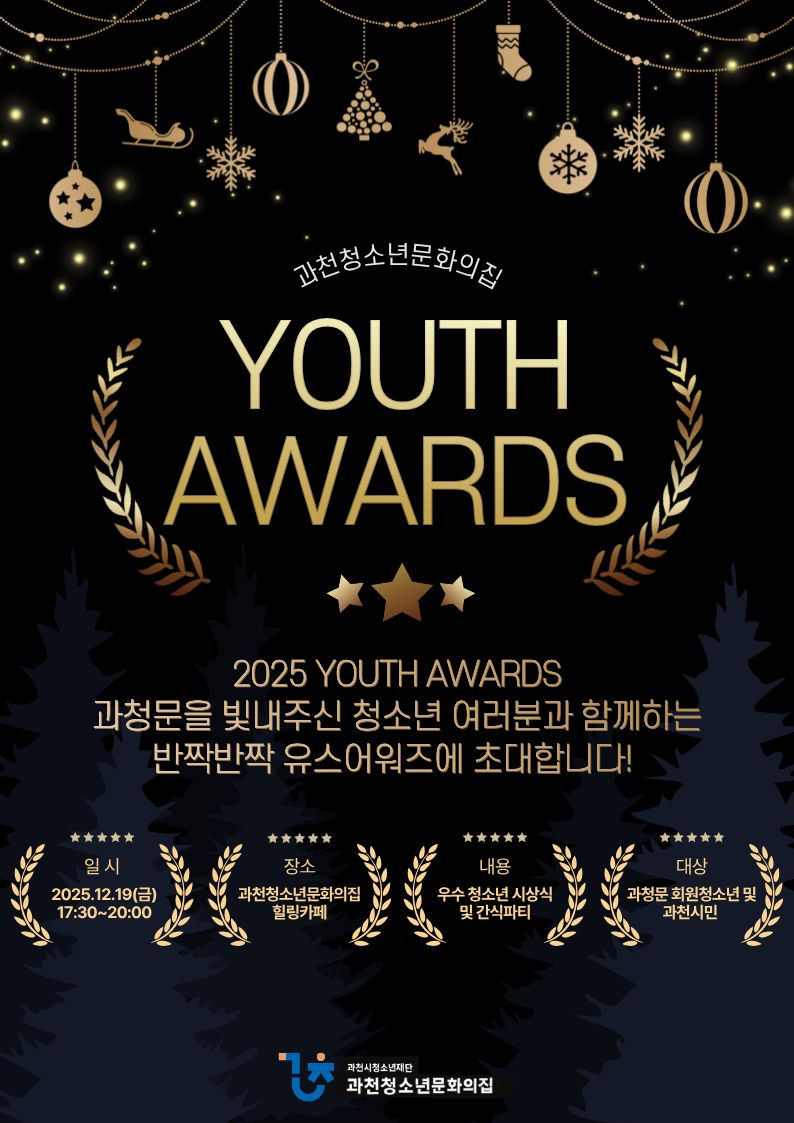 💫 2025 YOUTH AWARDS 💫 올 한 해 과청문을 반짝✨ 빛내주신 청소년 여러분을 위해 귀엽고 특별한 시상식이 준비되었어요! 🎀 ❄️ 일시 | 12/19(목) 17:30~20:00 ❄️ 장소 | 과청문 힐링카페 ❄️ 내용 | 우수청소년 시상식🏆, 신나는 레크레이션🎲, 달콤한 간식파티🍪💗 ❄️ 대상 | 과청문 청소년 및 과천시민 누구나! 올해 열심히 참여해주신 친구들부터 매일 꾸준히 찾아와 주신 ‘출석왕’까지! 👑✨ 과청문을 반짝이게 해주신 주인공은 누구일까요? 따뜻한 연말 분위기 속에서 함께 즐길 준비 되셨나요? 🥳💕 12월 19일, 과청문에서 기다리고 있을게요! 🐾🎀 💗유스어워즈 시상식 참가 친구들은 설문지로 참가 신청 부탁드립니...