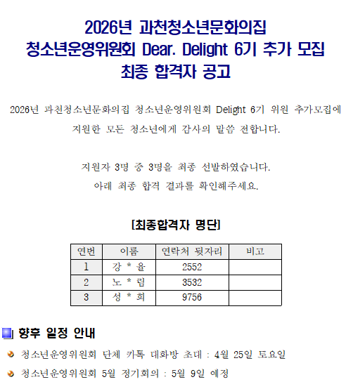 2026년 청소년운영위원회 Delight 6기 추가 모집 최종 합격자 공고