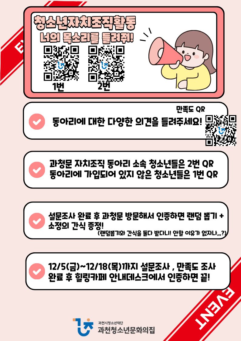 자치조직 비소속 일반 청소년들은 1번 QR로 접속, 설문조사 및 만족도 조사 완료 후 이벤트 기간 내 과청문 방문하여 인증하면 랜덤뽑기, 소정의 간식 증정