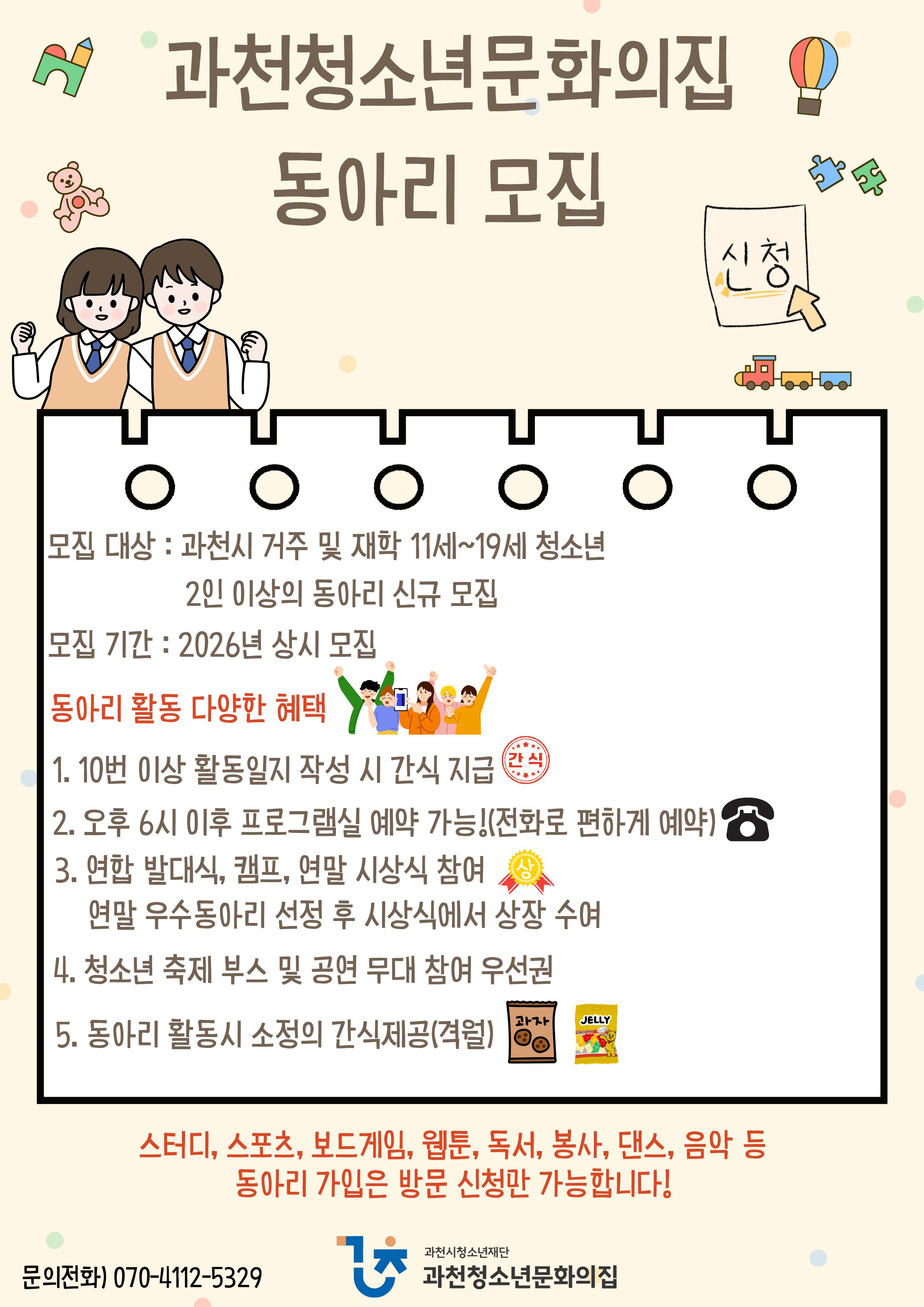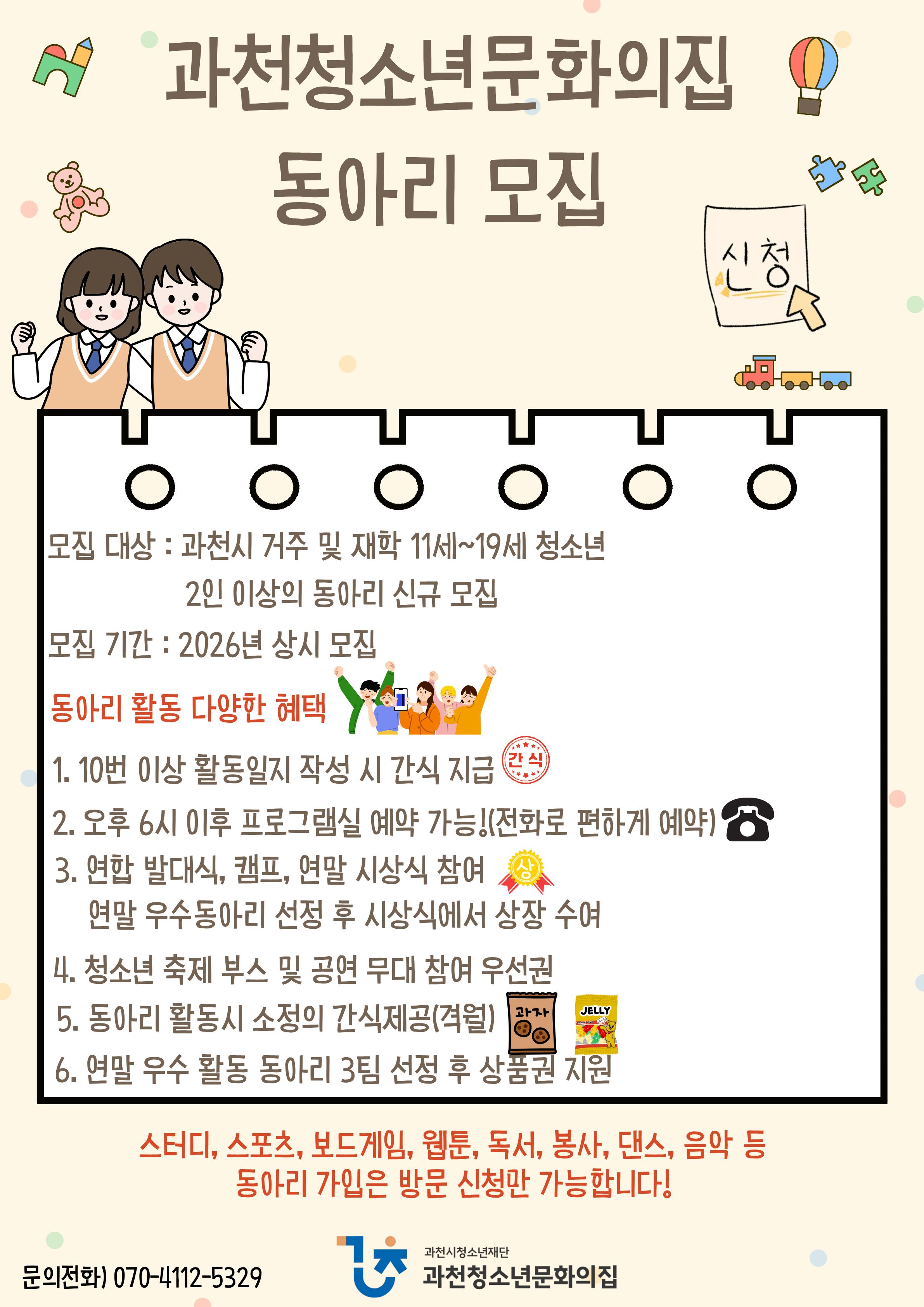 다양한 혜택과 함께 26년도 동아리 활동을 함께 할 청소년들을 모집하고 있으니 많은 관심과 신청을 부탁드립니다:)