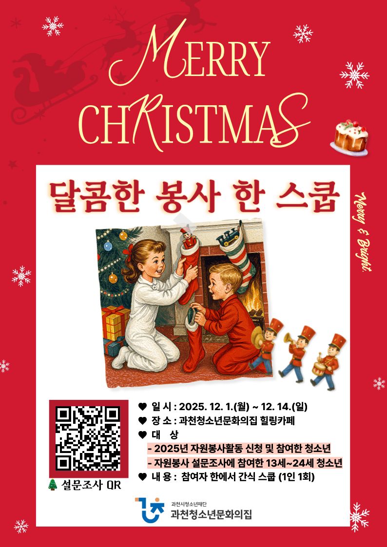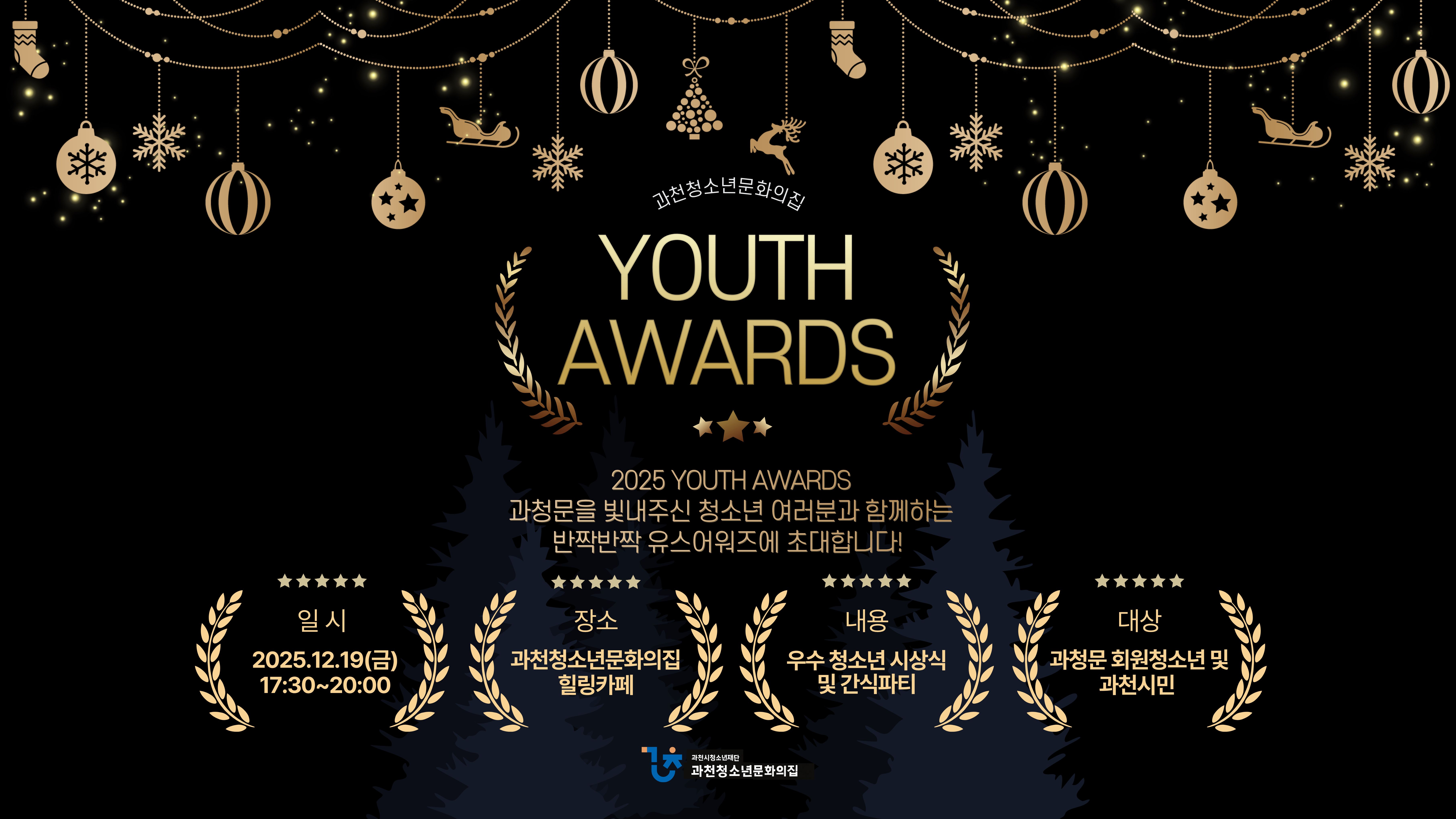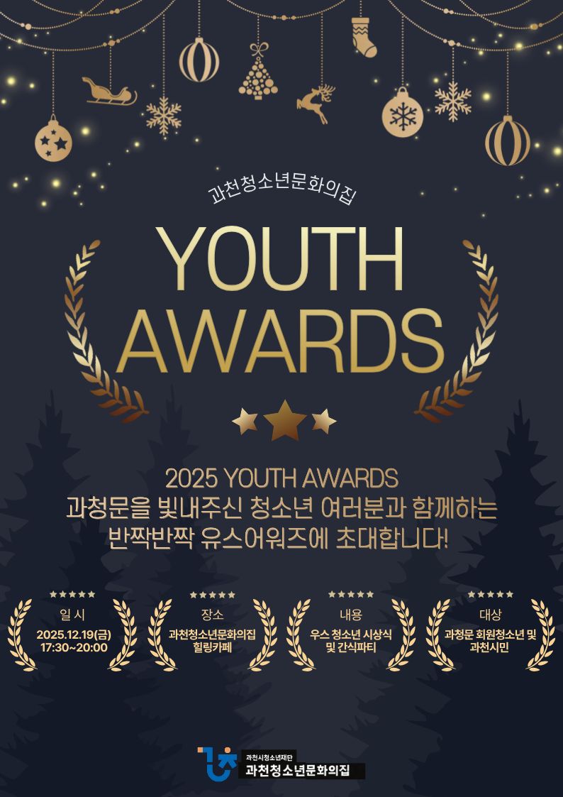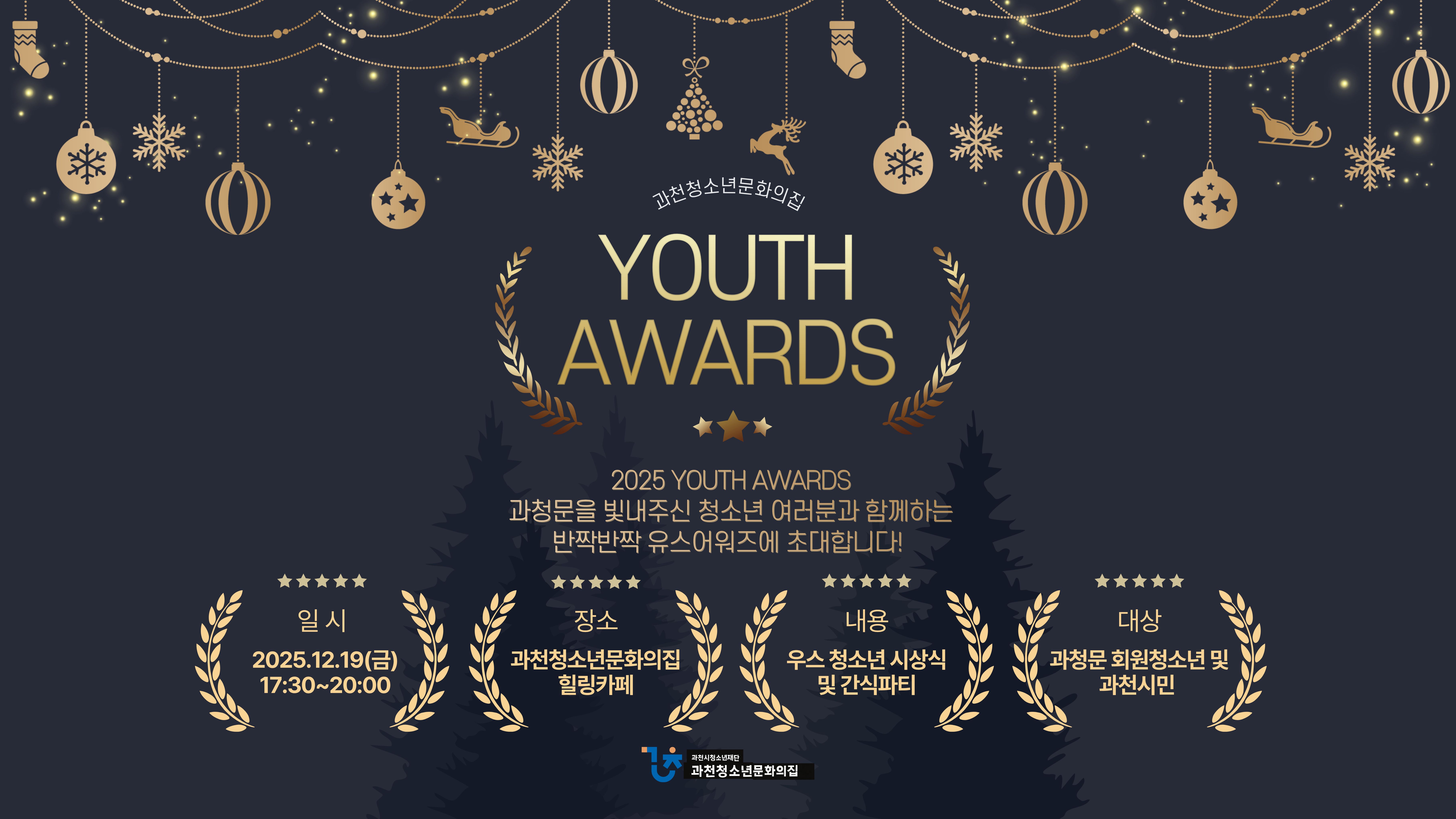 💫 2025 YOUTH AWARDS 💫 올 한 해 과청문을 반짝✨ 빛내주신 청소년 여러분을 위해 귀엽고 특별한 시상식이 준비되었어요! 🎀 ❄️ 일시 | 12/19(목) 17:30~20:00 ❄️ 장소 | 과청문 힐링카페 ❄️ 내용 | 우수청소년 시상식🏆, 신나는 레크레이션🎲, 달콤한 간식파티🍪💗 ❄️ 대상 | 과청문 청소년 및 과천시민 누구나! 올해 열심히 참여해주신 친구들부터 매일 꾸준히 찾아와 주신 ‘출석왕’까지! 👑✨ 과청문을 반짝이게 해주신 주인공은 누구일까요? 따뜻한 연말 분위기 속에서 함께 즐길 준비 되셨나요? 🥳💕 12월 19일, 과청문에서 기다리고 있을게요! 🐾🎀 💗유스어워즈 시상식 참가 친구들은 설문지로 참가 신청 부탁드립니...