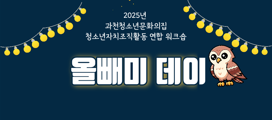 2025년 과천청소년문화의집 '올빼미 데이' 참가자 모집 -운영일시:10/24금) 17:00~22:00 -모집인원:11세~18세 청소년 50명 *과천청소년문화의집 자치조직 30명 +일반 청소년 20명 선착순 모집 -활동장소:과천청소년문화의집 -활동내용:팀별 레크레이션, 부스체험, 상품추첨, 간식시간 -신청링크:https://forms.gle/zrgswKX11bXHVSU79 -문의전화:070-4112-5328 즐겁고 재밌는 시간을 함께 보낼 청소년 여러분들! 많은 신청 부탁드립니다!