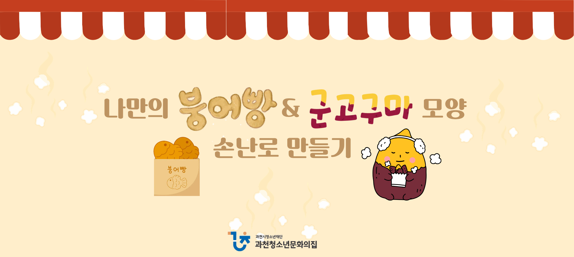 지역사회연계참여사업 '나만의 손난로 만들기' 참가자 모집 *운영일시: 11월 29일(토) 14:00~16:00 *모집인원: 11세~16세 청소년 10명 *활동장소: 과천청소년문화의집 활동실 *활동내용: 붕어빵&군고구마 모양 펠트로 나만의 손난로 만들기, 친구와 부모님께 선물하기 *신청링크: https://forms.gle/xt6hdWXkMAYDJGQ7A *문의전화: 070-4112-5329 청소년 여러분의 많은 참여 부탁드립니다!