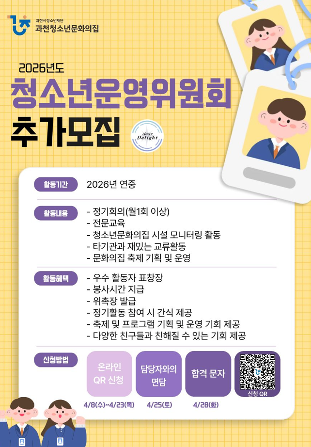 📢 청소년 자치조직 6기 추가 모집 안내 👏 과천청소년문화의집의 대표 청소년 참여기구! 2026년도 청소년운영위원회 6기 추가위원을 모집합니다🥳 과청문의 운영진이자 청소년 셀럽 역할을 담당하는 청소년운영위원회🤗 기관의 주요 운영 정책 및 청소년 프로그램에 관해 의견 제시와 모니터링을 함께 진행하며 청소년의 관점에서 문화를 만들어가는 자치조직입니다. 현재 6기 위원 추가모집이 절찬리 진행 중이오니 홍보 포스터 내용을 참고하시어 관심 있는 청소년들의 많은 참여 바랍니다! ✨ 6기 청소년운영위원회 참가 신청 안내 ✨ 📌 신청방법 ① 아래 참가신청 링크 접속 후 신청 https://forms.gle/DJCnVZNZ...